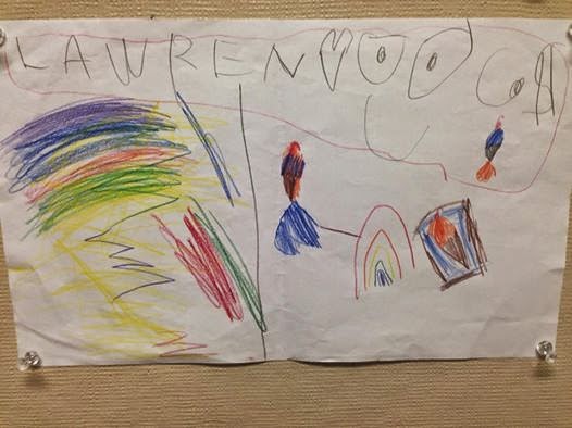 I call this one Rainbows and Ice Cream Cone, or Rainbows and Baby Jesus in a Manger from my heart to yours. I also adore that she spelled her name wrong and that there are googly eyes. The world would be a better place with more googly eyes.